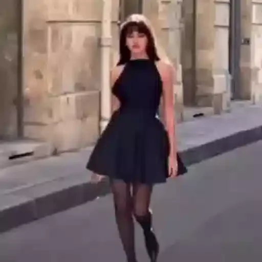 Mulher jovem com vestido preto curto e meias arrastão, andando na rua com um prédio de pedra ao fundo.