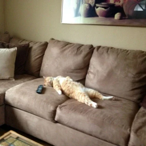 Gato laranja deitado no sofá com um controle remoto ao lado.