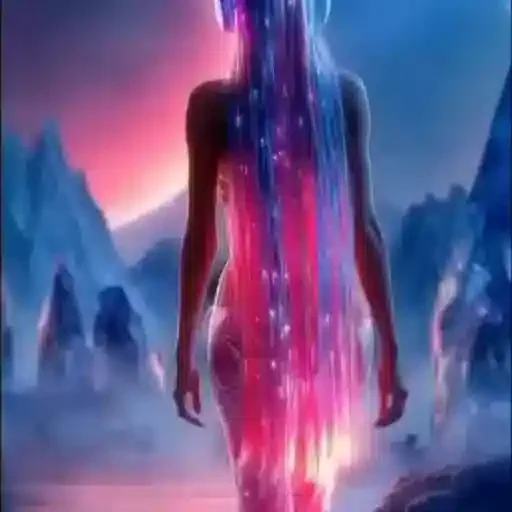 Uma mulher de costas, com corpo translúcido e colorido, em um ambiente místico com montanhas e céu rosa.
