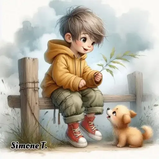 Menino com jaqueta laranja sentada em cerca de madeira ao lado de um cachorro castanho, com nuvens ao fundo. O menino tem cabelo castanho e óculos.