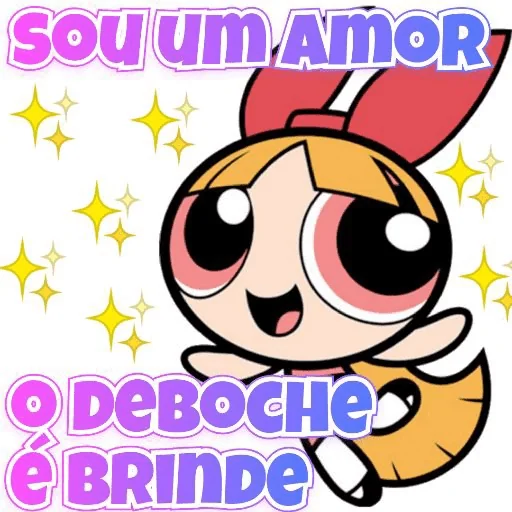 Uma figurinha colorida da Blossom, personagem do desenho Powerpuff Girls, com expressão feliz e olhos grandes. Ela tem o cabelo laranja e um laço vermelho na cabeça. O fundo é branco com estrelas amarelas e o texto 'SOU UM AMOR O DEBOCHE É BRINDE' em letras coloridas.