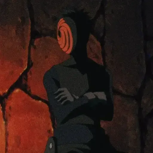 Personagem de anime com olhos vermelhos e rotação em espiral, braços cruzados em frente a uma parede de pedra com fundo vermelho.