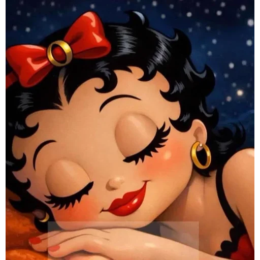 Betty Boop com os olhos fechados e um grande laço vermelho no cabelo, contra um fundo noturno estrelado.