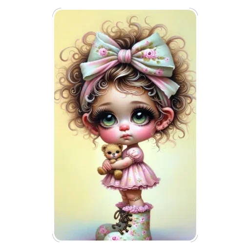 Menina fofa com laço na cabeça e ursinho, vestida de rosa. Fundo amarelo.
