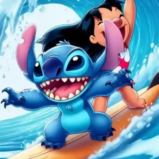 Stitch e Lilo surfando em uma onda azul, com Stitch sorrindo e mostrando os dentes, e Lilo atrás com os braços levantados.