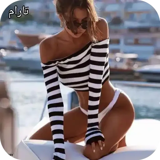 Mulher de biquíni branco e óculos de sol posando em um cais, com um fundo de barcos. Ela está usando uma blusa listrada preta e branca.