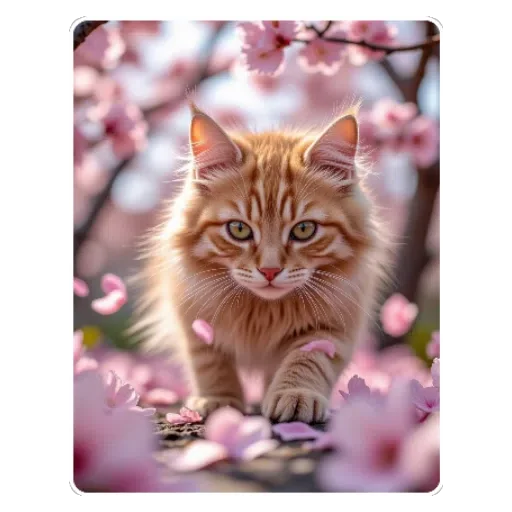 Gato fofinho de pelo comprido, cor marrom, laranja e branca, com folhas de flor de cerejeira caindo ao redor.