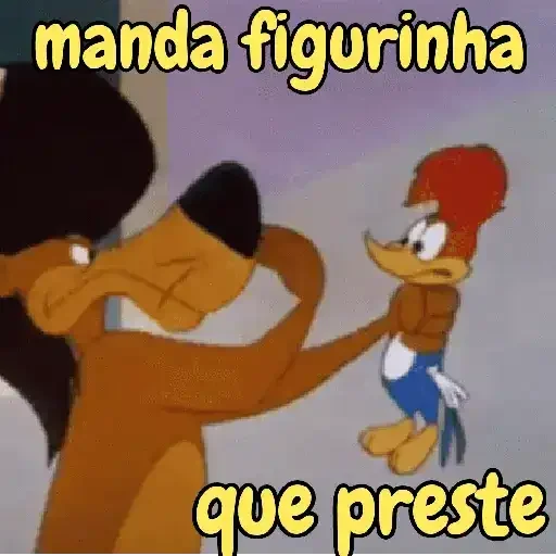 Personagem de desenho animado com cabelo preto e outro com cabelo vermelho fazendo uma pose engraçada, com a frase 'manda figurinha que preste' em texto amarelo.