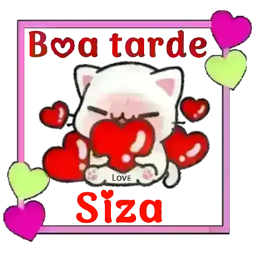 Um gato branco fofinho com um coração vermelho na frente, cercado por corações coloridos e texto 'Boa tarde Siza'.