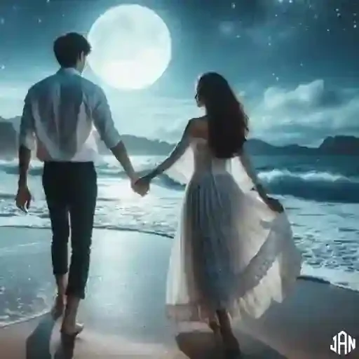 Um casal caminha de mãos dadas pela praia à noite, sob a luz da lua cheia. O homem veste uma camisa branca e calça preta, enquanto a mulher usa um vestido branco.