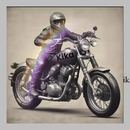 Um motociclista em uma moto preta com o nome 'Kika' no tanque, usando um capacete e roupas escuras, com um efeito de luz roxa.