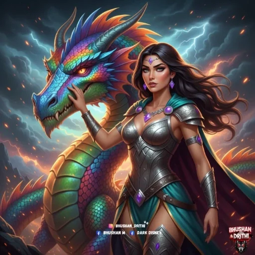 Uma mulher com armadura prateada e cabelos longos ao lado de um dragão colorido com chifres, em um cenário de tempestade com raios.