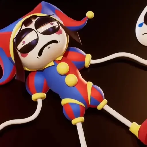 Um boneco de palhaço triste e desanimado com expressão facial de desânimo, usando um chapéu e um traje de palhaço colorido.