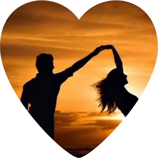 Um casal em silhueta dançando ao pôr do sol em um coração