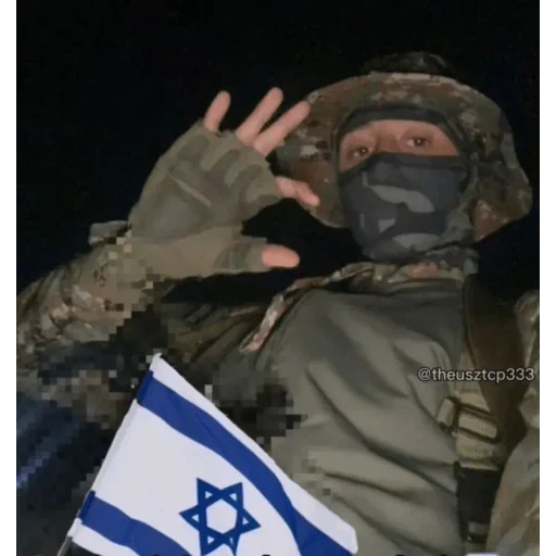 Soldado com máscara e capacete, fazendo um gesto com a mão, segurando uma bandeira de Israel.