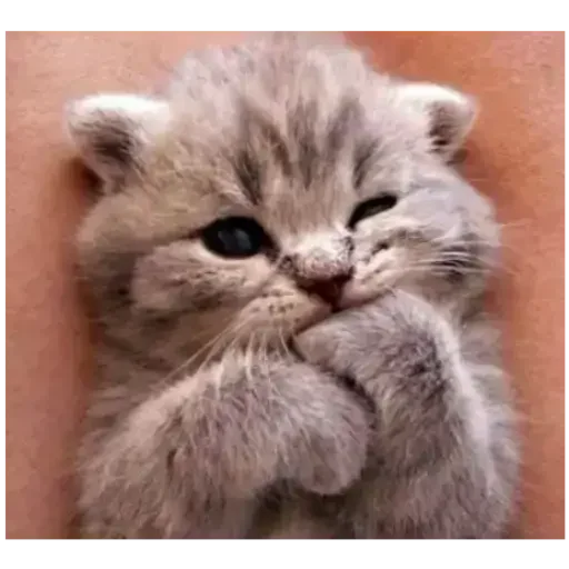 Gatinhho cinza com olhos azuis, focinho rosa, e pelagem fofa, fazendo careta com a pata na boca.