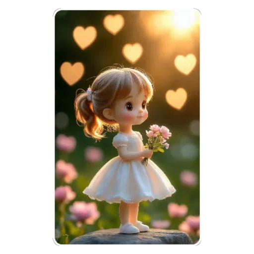 Uma menina de vestido branco segurando flores em um jardim com corações ao fundo.