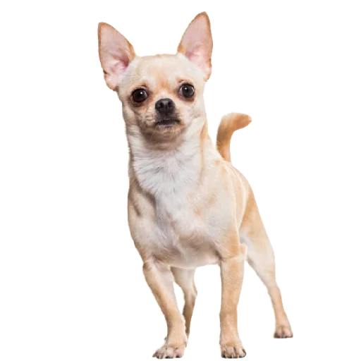 Um cachorro Chihuahua deitado em pé, com pelagem clara e orelhas grandes.