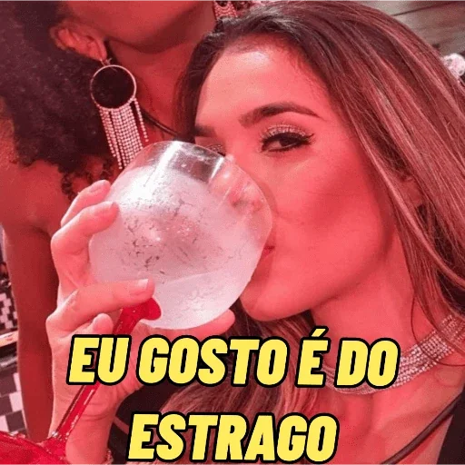 Mulher com cabelo castanho e unha vermelha bebendo de um copo grande com texto "EU GOSTO É DO ESTRAGO" em amarelo.