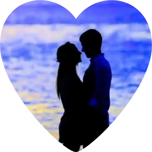 Um casal se beijando em silueta contra o fundo de um mar com ondas, dentro de um coração.