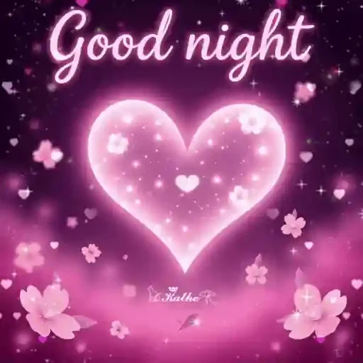 Coração rosa brilhante com flores de cerejeira e estrelas em fundo roxo. 'Good night' em letras cursivas rosa.