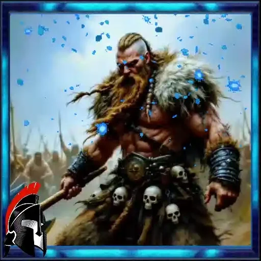 Um guerreiro musculoso com barba longa e cabelo castanho, vestindo uma saia com caveiras e um colar de contas, empunhando uma arma em um campo de batalha.