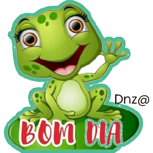 Um sapo verde cartoon com olhos grandes e um sorriso, sentado em uma folha com a inscrição 'Bom Dia'.
