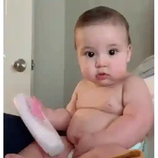 Um bebê deitado de bruços, com uma expressão curiosa no rosto, segurando um objeto branco e rosa.