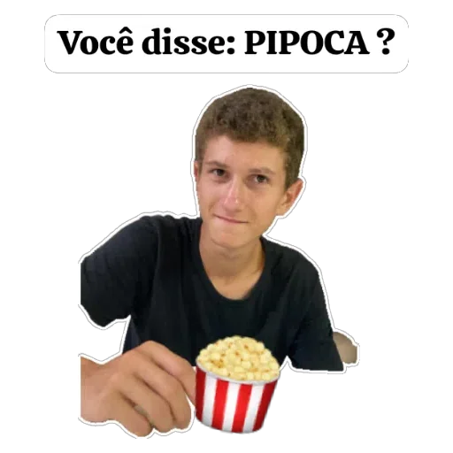 Um jovem com uma expressão surpresa segurando uma tigela de pipoca vermelha e branca com a legenda 'Você disse: PIPOCA?'