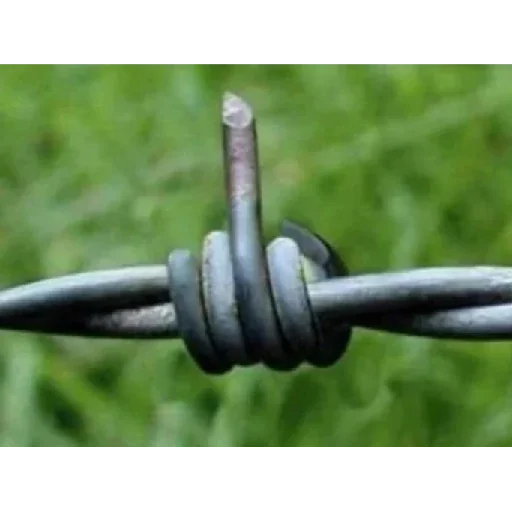 Arame farpado com uma ponta afiada em um campo verde desfocado.