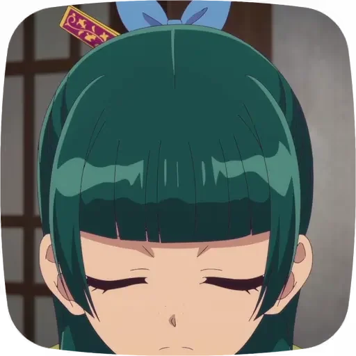 Rosto de uma menina de anime com cabelos verdes e olhos fechados, com um enfeite vermelho e amarelo no cabelo.