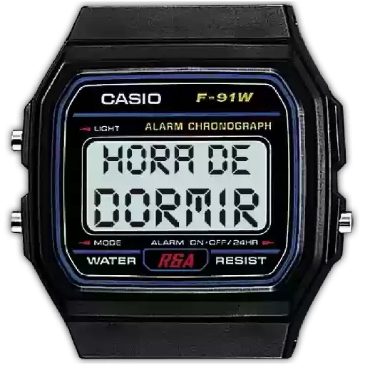 Um relógio digital preto da Casio com a tela mostrando 'HORA DE DORMIR'.