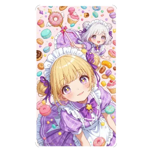 Duas meninas vestidas de empregada, uma loira e outra grisalha, com fundo de donuts coloridos.