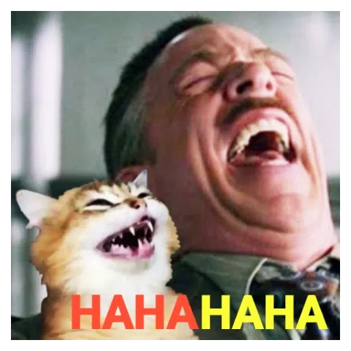 Um homem e um gato laranja estão rindo alto, com as bocas abertas e os olhos fechados. Abaixo deles, está escrito 'HAHAHAHA' em letras coloridas.