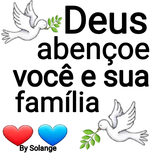 Uma mensagem de bênção com duas pombas brancas carregando folhas verdes, acompanhadas de um coração vermelho e outro azul, e o texto 'Deus abençoe você e sua família'.