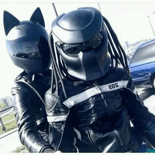 Dois personagens com máscaras pretas, um com orelhas de gato, vestindo jaquetas de couro preto, em frente a um carro azul.