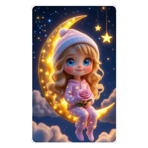Menina fofa sentada na lua com um gorro branco, vestindo roupa rosa, com estrelas e nuvens ao fundo.