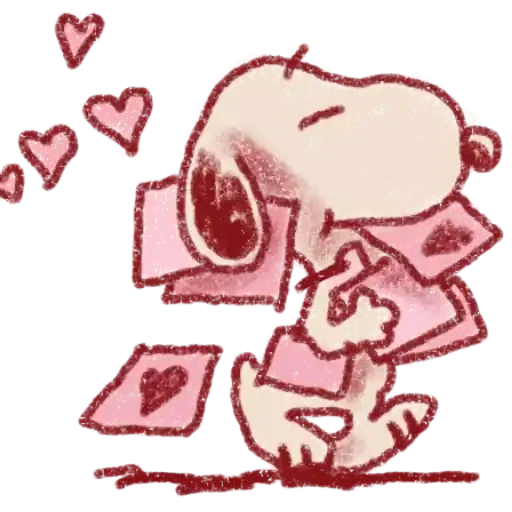 Snoopy com olhos fechados e bocado de cartas de amor com corações, cercado de corações rosa no ar.
