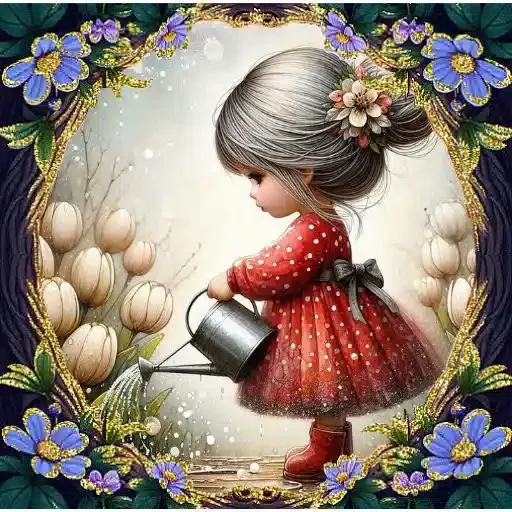Menina de cabelo grisalho em um coque com flor, usando vestido vermelho com branco, regando plantas com regador prateado, emoldurado por flores e tulipas.