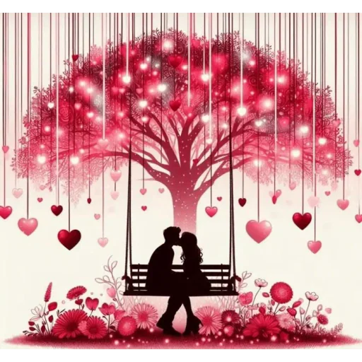 Um casal beijando sentado em um banco sob uma árvore rosa com corações pendurados e flores.