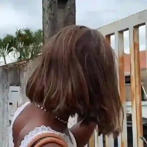 Uma mulher com cabelo preto molhado e uma expressão facial sutil, possivelmente de surpresa ou reação.