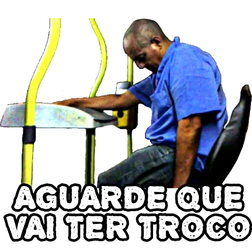 Um homem de camisa azul e calça jeans, com expressão de cansaço ou desânimo, sentado em uma cadeira preta, trabalhando em um computador com um monitor e teclado. Abaixo dele, está escrito 'AGUARDE QUE VAI TER TROCO'.