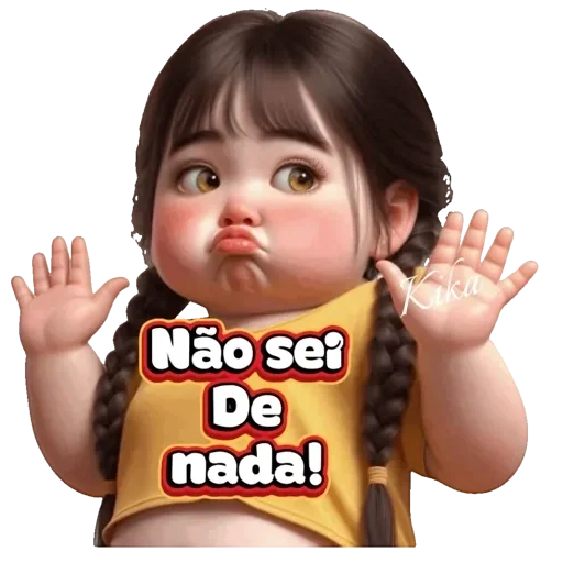 Menina de expressão confusa, com as mãos levantadas e texto 'Não sei De nada!' sobre a camisa amarela.