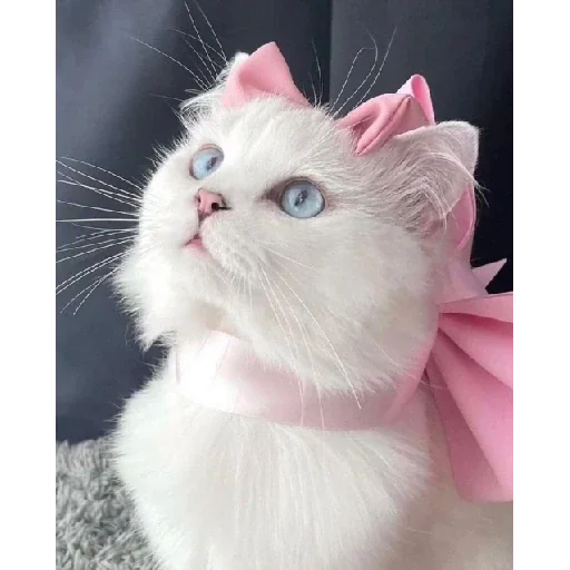 Gato branco com olhos azuis, vestido com um laço rosa na cabeça e uma faixa rosa no pescoço, olhando para cima.