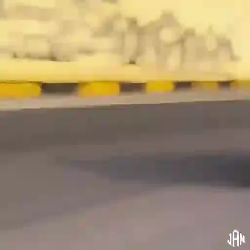 Uma estrada cinzenta com uma faixa amarela e preta ao fundo, com nuvens no céu. Há um logotipo branco no canto inferior direito.