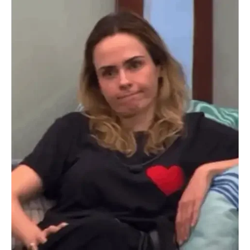 Mulher com expressão séria, cabelo castanho, vestindo uma blusa preta com um coração vermelho no peito.