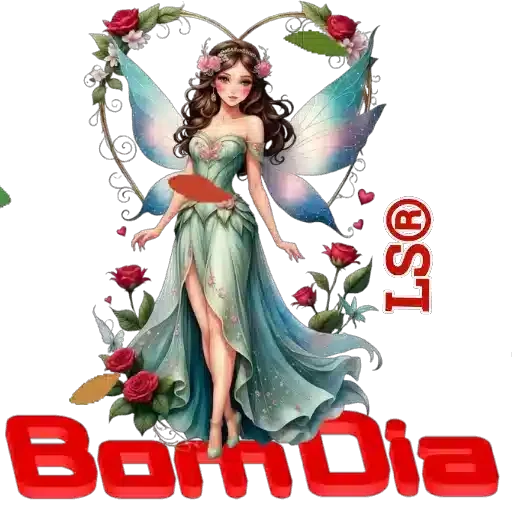 Uma fada com asas coloridas e vestido verde, rodeada de rosas vermelhas e folhagens, com o texto 'BornDia' em vermelho na parte inferior.