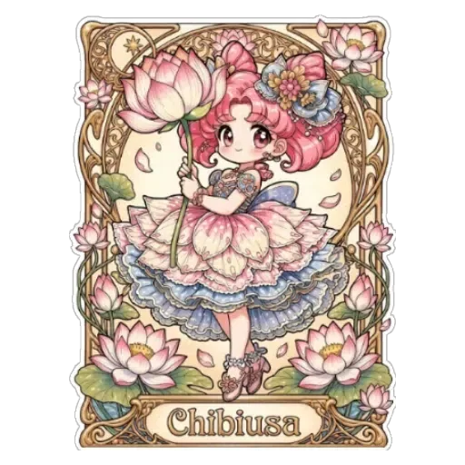 Uma menina fofa com cabelo rosa e um vestido florido segura uma flor grande. Ela está cercada por flores e folhas em um quadro decorativo com o nome 'Chibluza' na parte inferior.