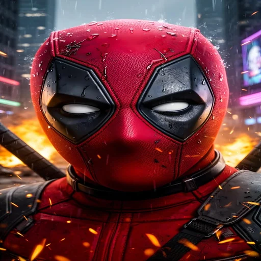 Deadpool com máscara vermelha e olhos pretos em uma cena de cidade em chamas, com partículas de fogo ao redor.
