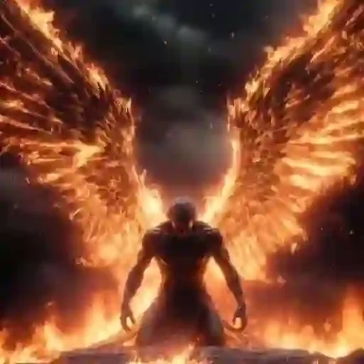 Um homem de costas com asas de fogo atrás dele, em meio a chamas e um céu escuro com nuvens.